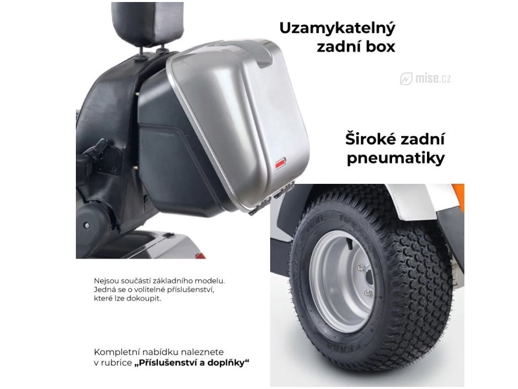 Z volitelného příslušenství doporučujeme přikoupit zadní uzamykatelný box, držák na berle, široké pneumatiky na zadní kola nebo střechu.