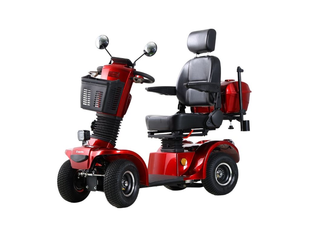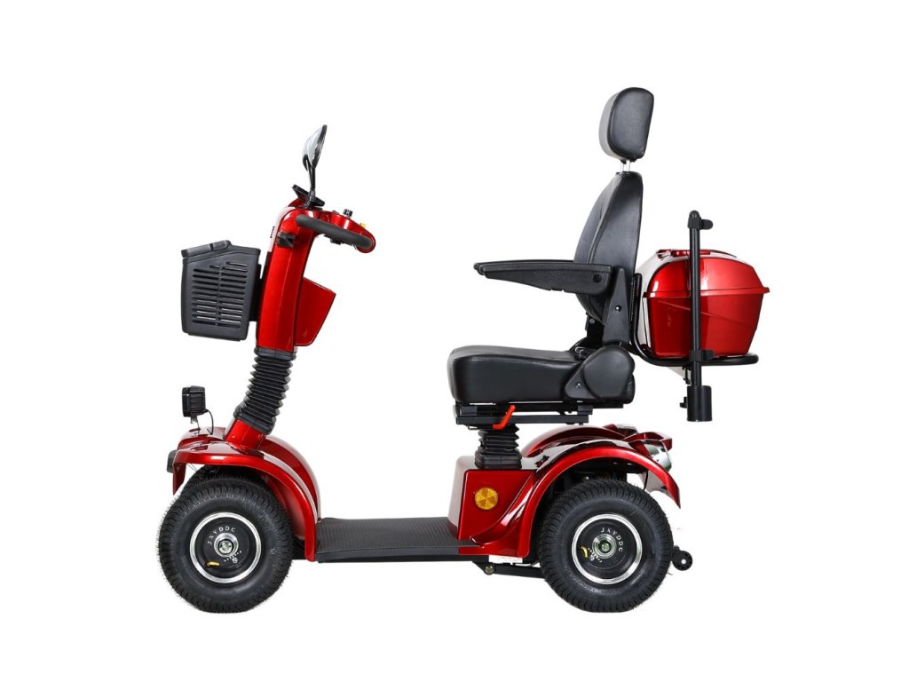 Stabilní elektrický čtyřkolový vozík bez nutnosti ŘP, elektromagnetické brzdy, digitální displej, polohovatelné a otočné sedadlo, úložný prostor.