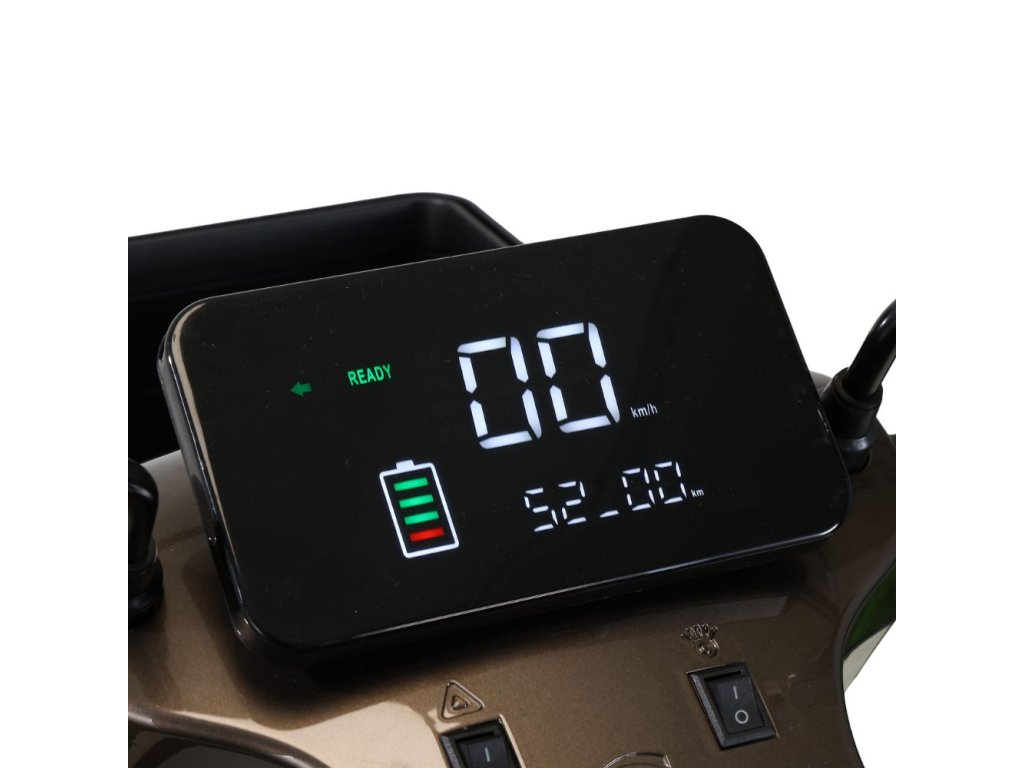 Vozík je vybaven tichým bezkartáčovým motorem o výkonu 500 W a olověnou baterií 20Ah/48V, která vám zajistí dojezd až 40 km na jedno nabití. Rychlost lze nastavit na 15 nebo 20 km/h, takže si jízdu přizpůsobíte přesně podle situace.
