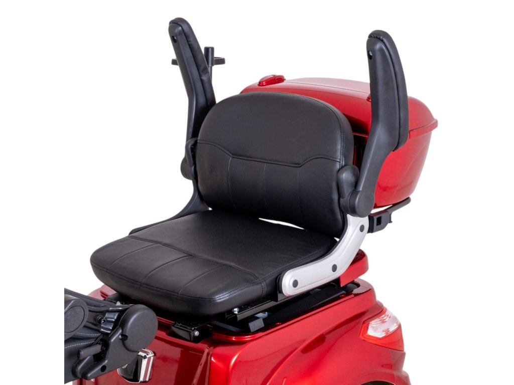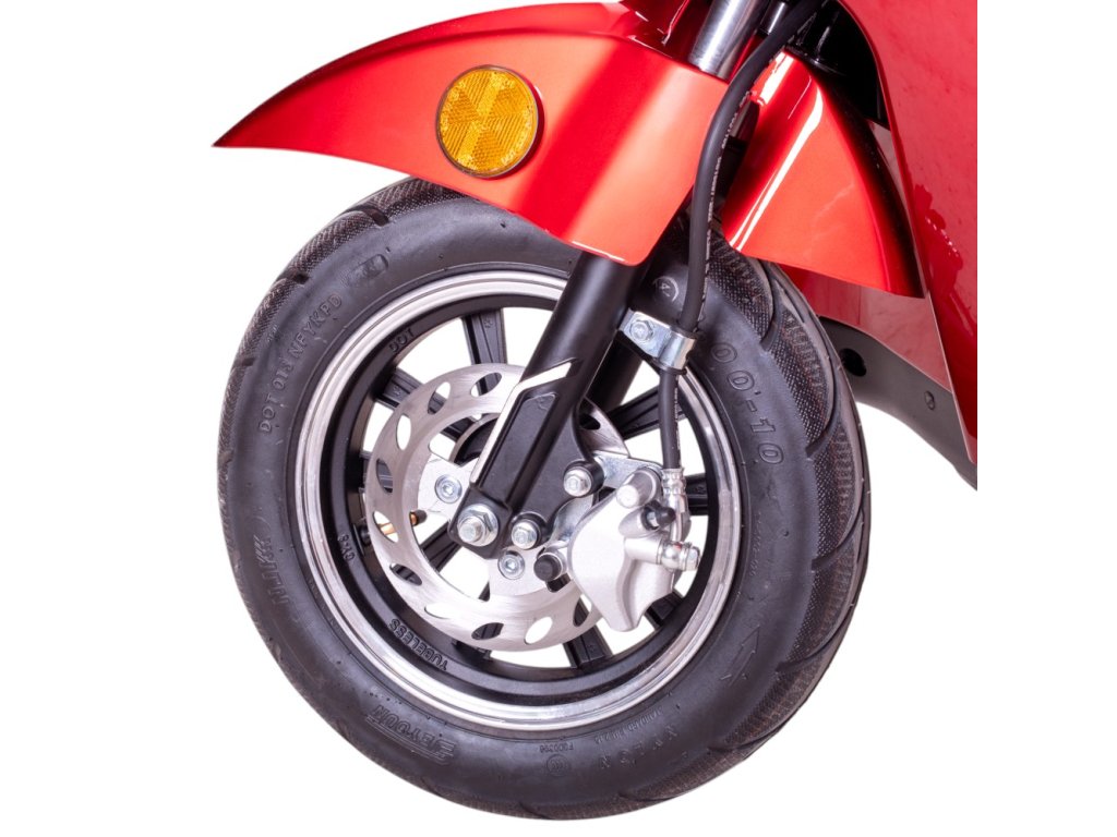 Stabilní tříkolový podvozek s 10" koly a kombinací kotoučové a bubnových brzd vás podrží i v ostřejších zatáčkách. O bezpečnost se postará kompletní osvětlení, blinkry, zpětná zrcátka a praktický držák na francouzské hole či deštník. Nechybí zadní pomocná kolečka proti převrácení. Navíc díky bezdušovým pneumatikám nemusíte mít obavy z defektu a vychutnat si tak klidnou jízdu.
