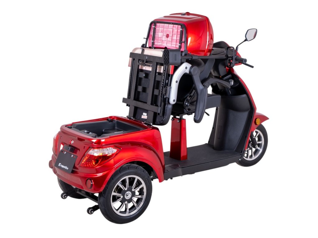 Tříkolový elektrický skútr pro dva, bez nutnosti ŘP, digitální displej, 3 rychlostní režimy, bezpečnostní alarm, prostorná a pohodlná sedadla se sklopnými opěrkami.