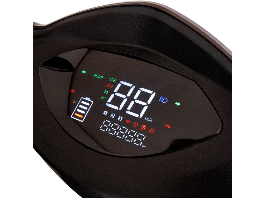 - ovládání: nastavení rychlosti, indikátor stavu baterie, osvětlení, signalizace, klakson, ujetá vzdálenost
