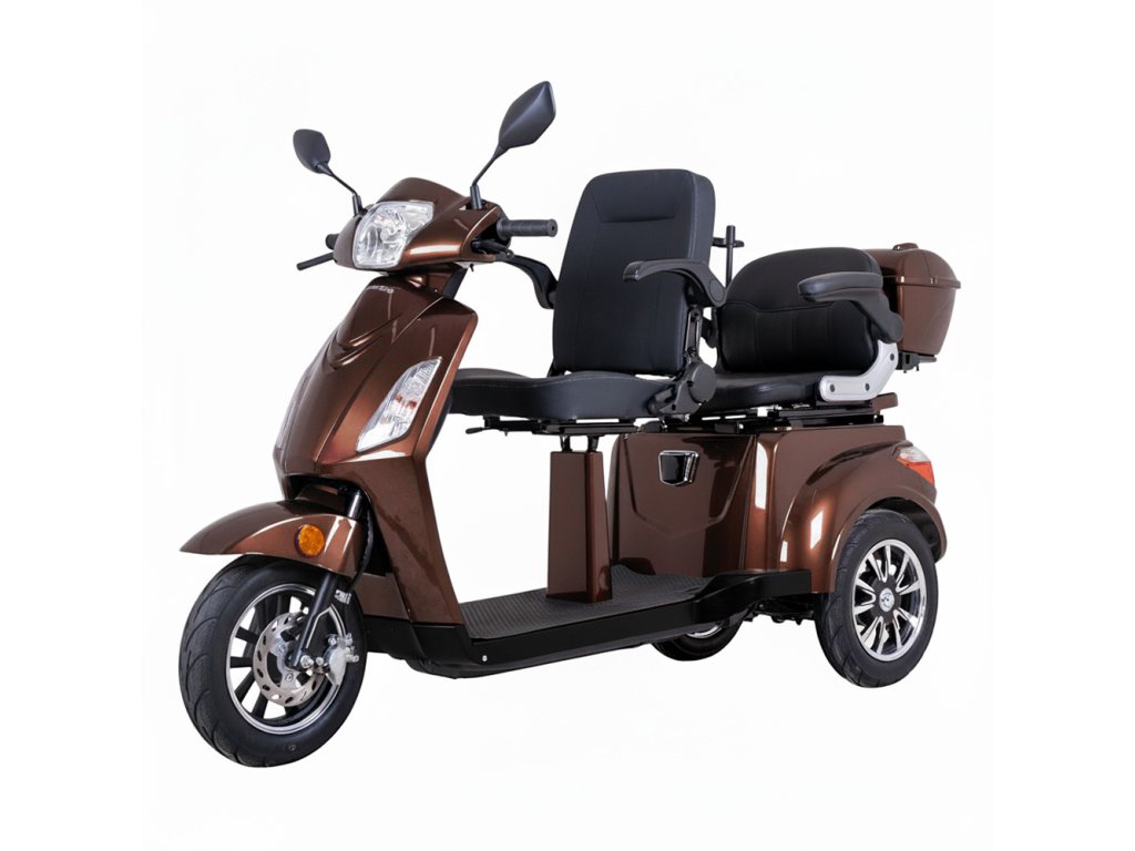 Tříkolový elektrický skútr pro dva, bez nutnosti ŘP, digitální displej, 3 rychlostní režimy, bezpečnostní alarm, prostorná a pohodlná sedadla se sklopnými opěrkami.