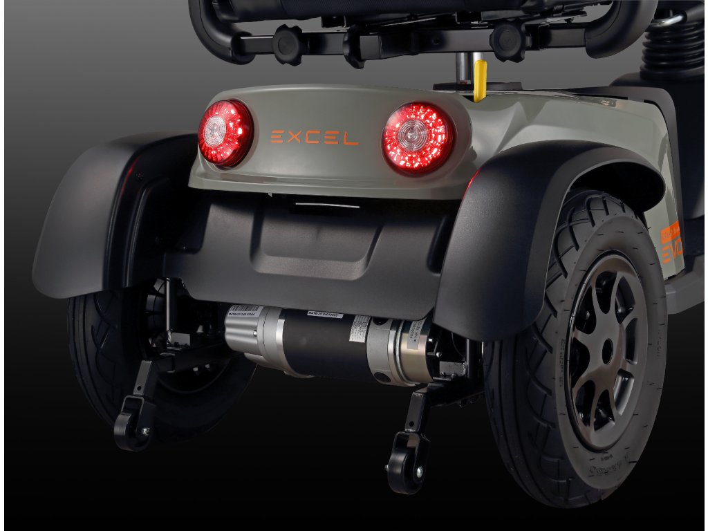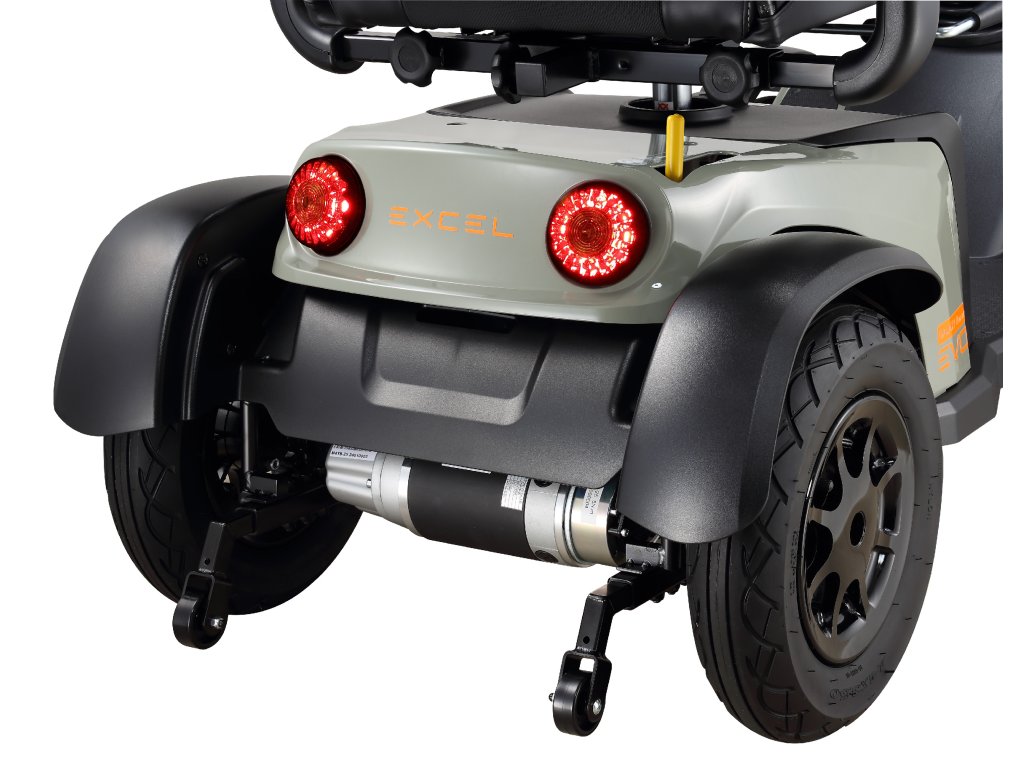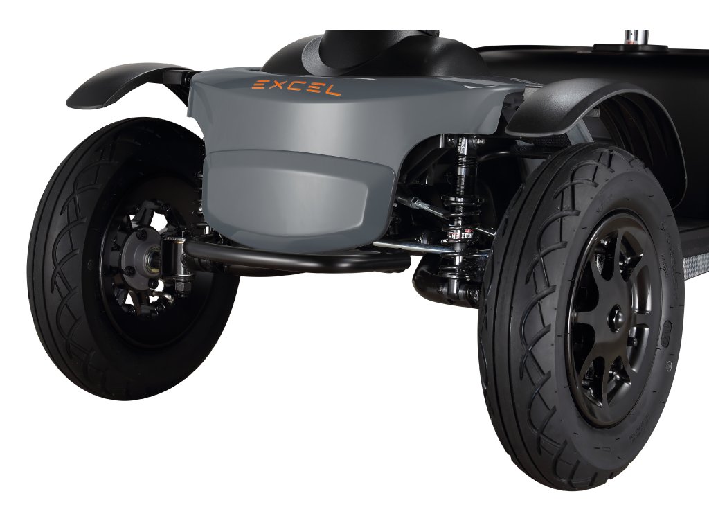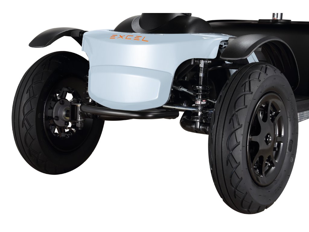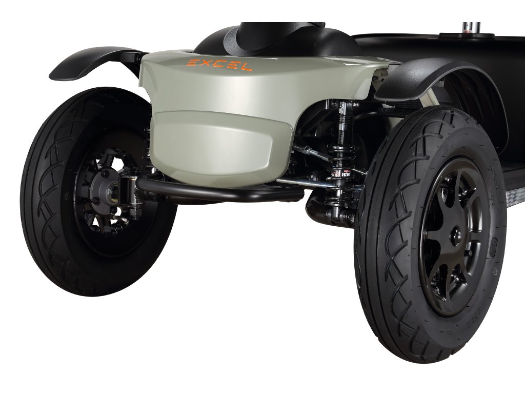 Skútry Excel Galaxy EVO jsou především o pohodlí a přizpůsobitelnosti. Každý model je vybaven předním a zadním odpružením, kde nastavitelné zadní odpružení je vybaveno teleskopickými tlumiči, Díky nimž jsou nerovnosti na silnici bez námahy absorbovány. To zajišťuje plynulou a pohodlnou jízdu i na nerovném nebo hrbolatém terénu. Odpružení zajišťují také pneumatiky, jejichž přední část tvoří ráfky z lehkých slitin, a které poskytují mimořádnou přilnavost, boční stabilitu a jízdní komfort.