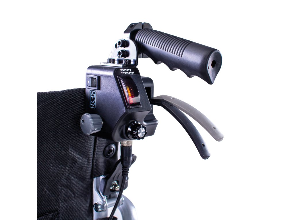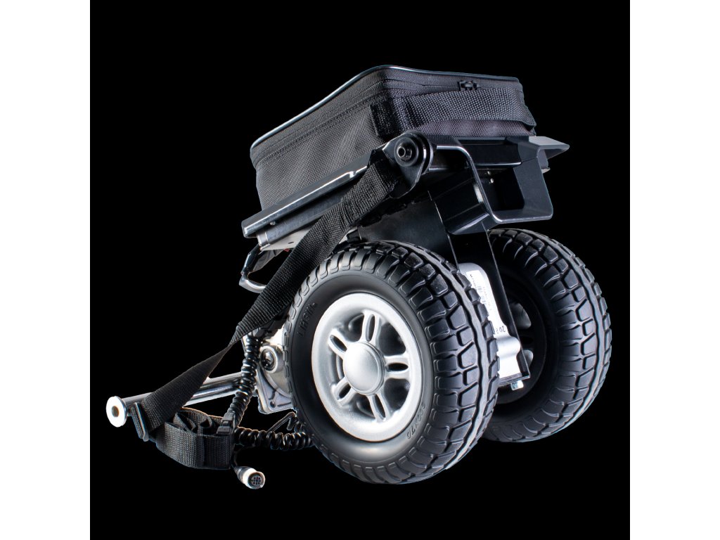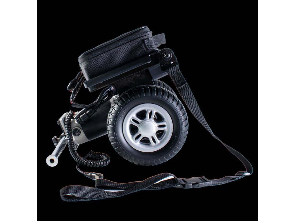 Proto vám tady nabízíme řešení. Zadní motor, který může být připevněn během pár vteřin na většinu skládacích mechanických vozíků. Nabízíme Vám 3 různé druhy. Tady máme Click & Go Lite, který je snadný na přenášení.